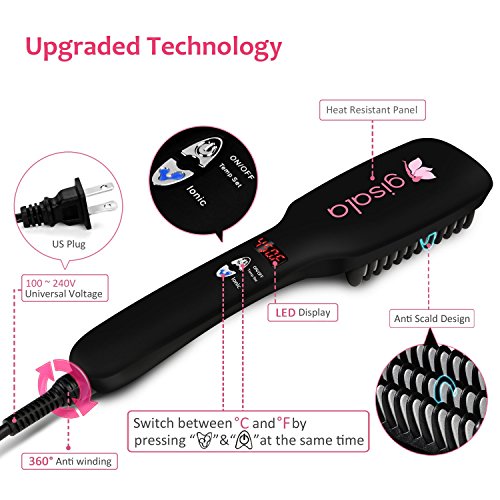 Gisala Ceramic Tourmaline Ionic Hair Straightener with Gloves,LED Display Detangling Hair Brush with Blade Heater, Instant Magic Silky,Adjustable Temperature, Anti Scald Teeth,2 FREE Hair Clips(Black)