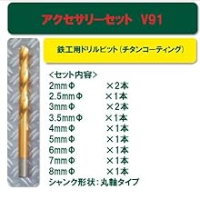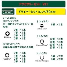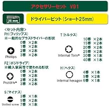 ●ドライバービット 25 mm: PH0 (x2), PH1 (x2), PH2 (x2), PH3 (x2), PZ0 (x2), PZ1 (x2), PZ2 (x2), PZ3 (x2), S3, S5 (x2), S7, T10 (x2), T15 (x2),T20 (x2), T25 (x2), T30, T40