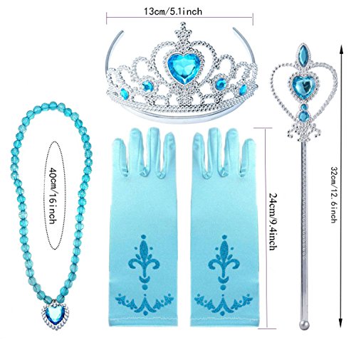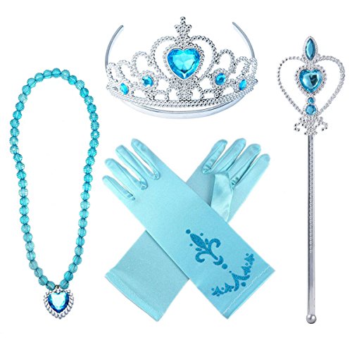 Accessories 4 set includes: Pair of shimmering blue Gloves + Tiara/Crown + Magic Stick/Wand/Scepter + Blue Heart Necklace.