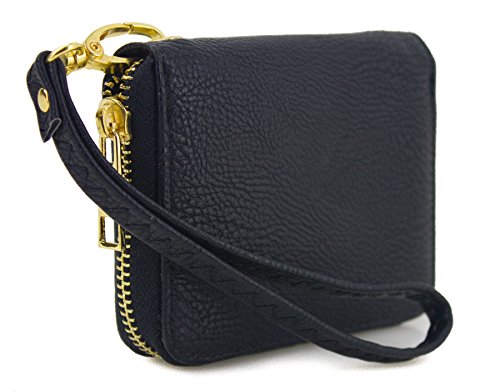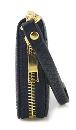 Features: Simple but classic mini-size daily coin change wristlet or wallet. Zipper arround opens main compartment, 4 credit card slots, 1 coin pocket, 1 standard size slot for US dollar bills.
