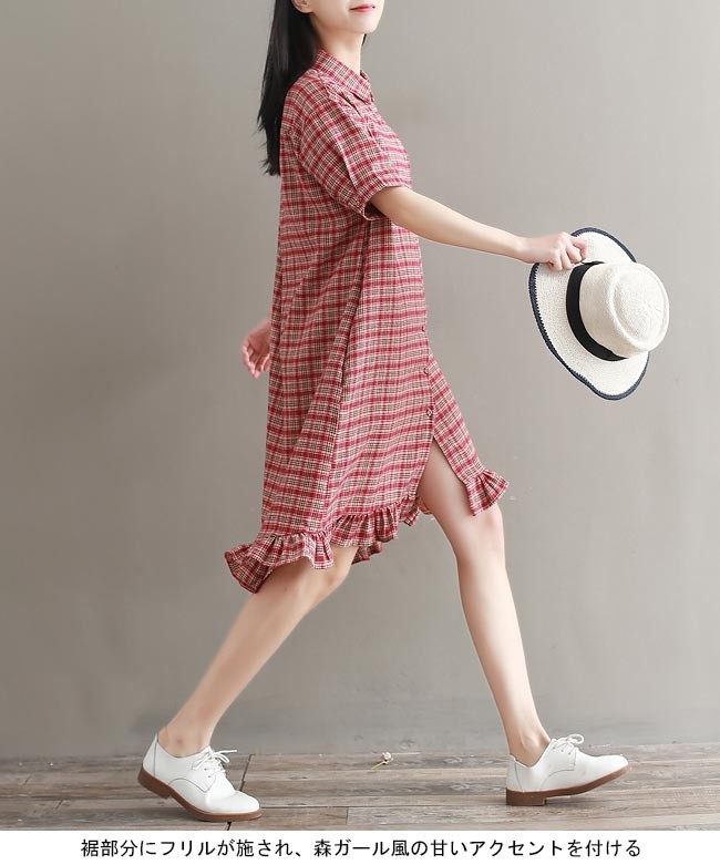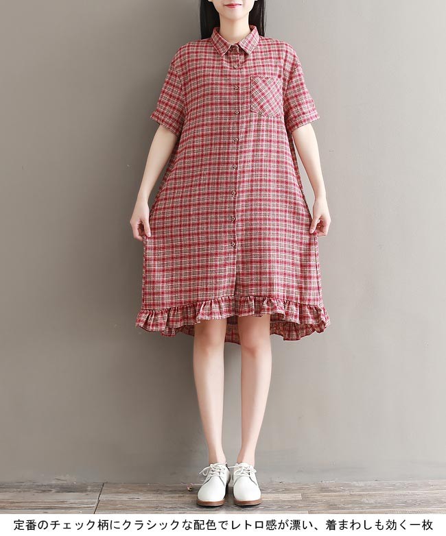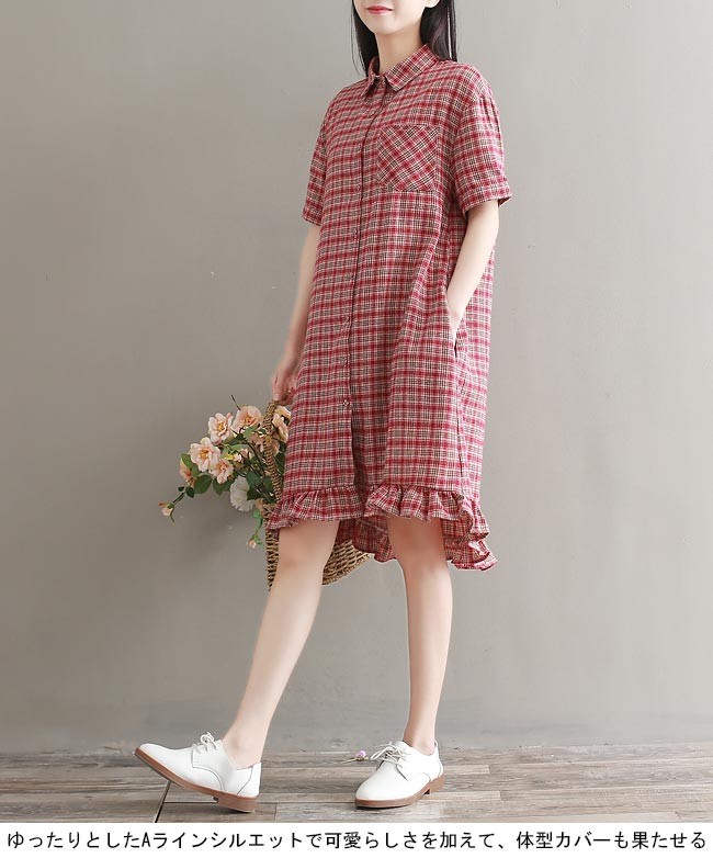 シャツワンピ チェック柄 半袖 レディース ワンピース 体型カバー 女性用 膝丈ワンピース 前開き 夏物 ゆったり 半袖ワンピース ミディアム丈レディース用の半袖ワンピースが登場吸湿性・通気性に優れた綿混紡素材を厳選、大きめのサイズ感で夏に最適な着心地をもたらすシャツワンピの仕様で女性ならではのスッキリ感を演出ゆったりとしたAラインシルエットで可愛らしさを加えて、体型カバーも果たせる裾部分にフリルが施され、森ガール風の甘いアクセントを付ける定番のチェック柄にクラシックな配色でレトロ感が漂い、着まわしも効く一枚カラー:写真色素材 綿混紡サイズ(cm) M L XL 2XLM バスト108 総丈94 肩幅48L バスト112 総丈95 肩幅49XL バスト116 総丈96 肩幅502XL バスト120 総丈97 肩幅51ご注意:※サイズは平置きサイズです。素人採寸ですので、若干の誤差がございます、ご了承ください。