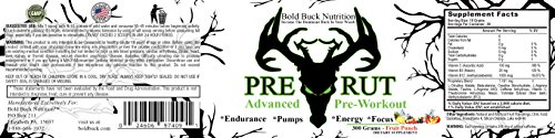 Studio : Bold Buck Nutrition Publisher : Bold Buck Nutrition Binding : Health and Beauty Product Description Become the Dominant Buck in Your Woods. This advanced pre-workout won't just give you a caffeine buzz. It's scientifically formulated to make you want to rip the door off the gym and start training! ? Pre-rut will give you the concentration to be laser focused on your routine. Thanks to its Caffeine and Theobromine in "Anhydrous" form, Pre-Rut delivers a more potent dose of stimulating ingredients. ? Feel every rep as your muscle pumps tighten your skin. Pre-Rut contains a blend of powerful alkaloids and amino acids that create an insane pump. This blend increases blood flow by flooding your bloodstream with Nitric Oxide(NO). Bigger pumps and more blood flow means more nutrients and protein synthesis inside of the stretched muscle fibers. ? Power through your workout without cramping and fatigue, thanks to the increased blood flow and taurine support. Several ingredients help block and remove lactic acid during intense training. ? Recover faster and build more muscle with the help of the most studied sports supplement of all time. Creatine Monohydrate has been proven time and time again to be the single best athletic compound ever studied. From increased strength to improved recovery time, this ingredient does it all. ? Full Dosing for maximum results. You will receive 10 GRAMS of our powerful pre-workout per serving. What is the point of a pre-workout if it isn't dosed appropriately? Get yours absolutely risk free. If your not satisfied, just let us know. We offer a 100% money back guarantee. 0