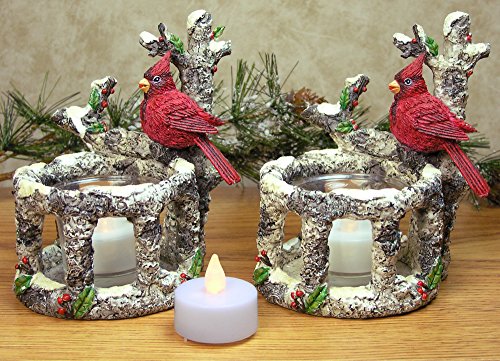 Cardinal Candle Holders - Set of 2 Red Cardinals Sitting on Birch Branches with 2 White Flameless Tealight Candles Included - Cardinal Decorations