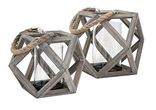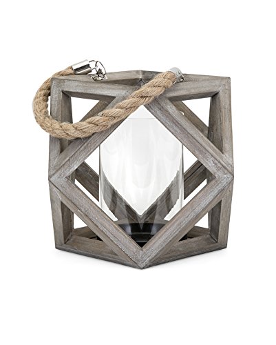 - Geometric lantern features a Gray weathered finish and a rope handle
