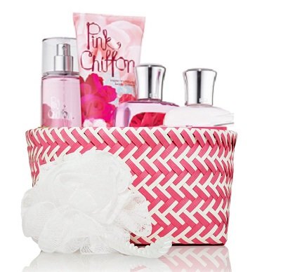 -. Feature : Signature Collection Herringbone Gift Basket PINK CHIFFON / Hand Picked By Us, Bundled By You! This ultra pampering gift includes all 3 steps of our All New Daily Trio: super lathering Shower Gel, our New Body Lotion now with 2x the Moisture & 3x the Shea and our skin-loving Fine Fragrance Mist. All this plus our Triple Moisture Body Cream, Shower Sponge & a timeless Herringbone Basket arrive unassembled so you can bundle, wrap & give with love. / KEY FRAGRANCE NOTES: Everything is prettier in Pink Chiffon! This light-as-air pairing of soft pink petals & vanilla chiffon icing expresses the flirty femininity of feeling pretty in pink / Gift Basket measures 8"L x 8"W x 4"H. For a limited time only! / Top Notes: Sparkling Pear, Peach Nectar, Wild Berries Mid Notes: Tiare Flower, Jasmine Petals, Waterlily, Sheer Apple Blossom Dry Notes: Coconut Milk, Vanilla Orchid, Creamy Sandalwood, Chiffon Musk