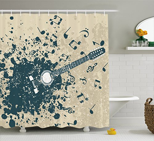 Modern Shower Curtain by Ambesonne, Acoustic Guitar on Retro Murky Background with Music Notes Melody Illustration, Fabric Bathroom Decor Set with Hooks, 70 Inches, Beige Dark Blue