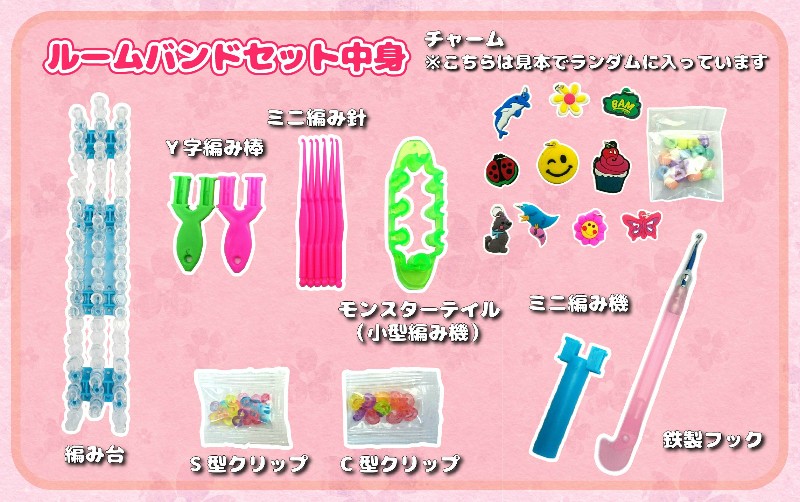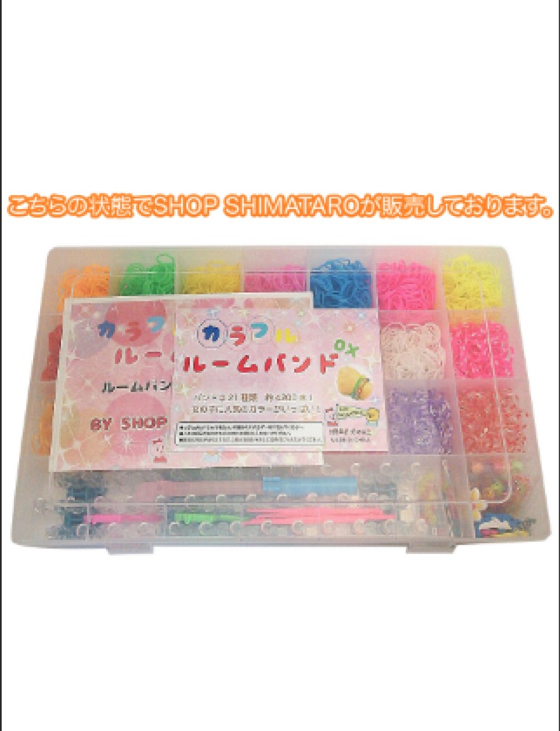 ・大人気、女の子が超はまっているカラフルルームバンドのコンプリートキットセットです。・プラスチックの仕分けケースにたっぷりのルームバンドと編み台、金属製編み棒、チャーム、留め具のカラフルなS、C字フックがセットされたスターターコンプリートセット!さらに大型、小型、Y字編み機の3つのパターンの簡単な編み方の説明書が入っているので初心者の方も安心して遊べます!・ルームバンドはたっぷり21種類、約4,200本のセット。女の子人気の上位カラーの色合いをすべて揃えております。写真のゴムの色の商品でございますのでご参考にしてください。・編み機は大型、小型、それぞれ1つずつ付属しております。さらにY字編み棒付き。大型編み針は金属製フックですので折れの心配がありません。小型のプラスチックフックも6本付属します。カラフルS,Cクリップはそれぞれ約12個入り4袋で合計96個付属しております。※鉄製フックついて、スケルトンピンクのカラーは生産終了しましたので、濃いピンクとなります。ご了承頂ければ幸いです。