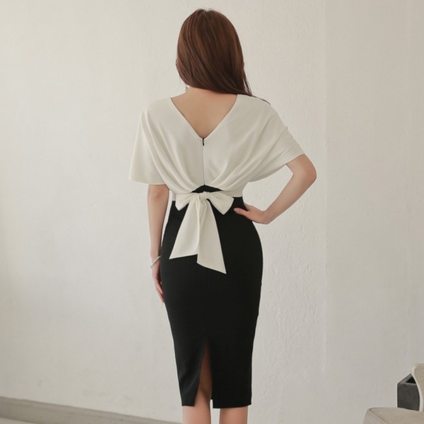 大きめのVネックがセクシーなツートーンカラーのワンピースです。