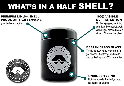 SMELL PROOF + LIGHT PROTECTION: With it's violet sealing element under the lid, the HALF SHELL allows you to store a 1/4 ounce of the most pungent herbs and spices without concern. Have a particularly stinky flavored tobacco? Have no fear, Dope Turtle's jars are here and will keep that smell contained and your herb fresh as the day you bought it. Light can be a destructive: the HALF SHELL comes with full protection from damaging visible light.