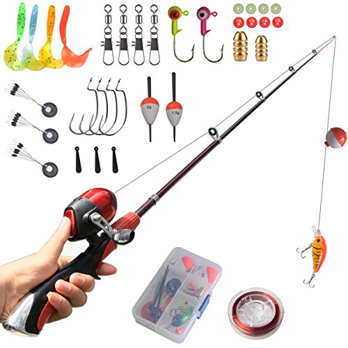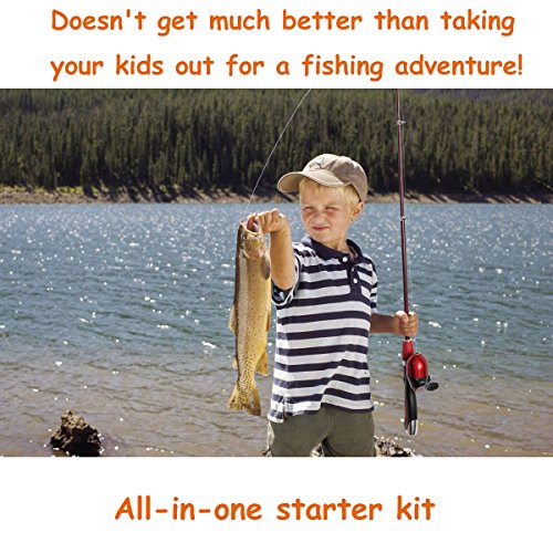 Kids Fishing Combo Full Set! It's equipped with a small tackle box which includes hooks, bobbers, lures, weights, swivels,etc! offers everything you need to catch trout, sunfish, bass and more! Perfect for ponds and lakes!