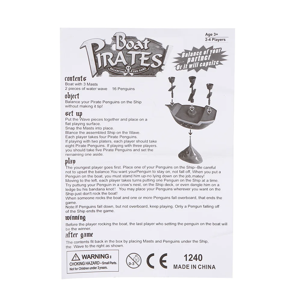 Are you ready for some fun? This balancing game is a great way to keep children entertained indoor. Each player places their penguins on the boat, trying to keep the boat balancing! Logical and strategic thinking come into play if you want to be the last player standing! If you rock the boat and send some penguins overboard, you will be a loser.
