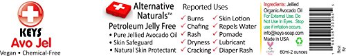 Try this multi-use, vegan alternative to petroleum jelly. Made of pure, organic jellied avocado oil, it naturally repels wind and water and can be used for burns, chafing, rashes, dryness, and cracked skin. Great as a skin lotion, pomade, personal lubricant, and diaper rash treatment. Alternative Naturals: alternative solutions to drugstore brands Features pharmaceutical grade ingredients in therapeutic proportions. Contains no petrolatum, wax, or synthetics. Gluten-Free, Soy-Free, No Preservatives, and Chemical-Free Made in the USA.Feature