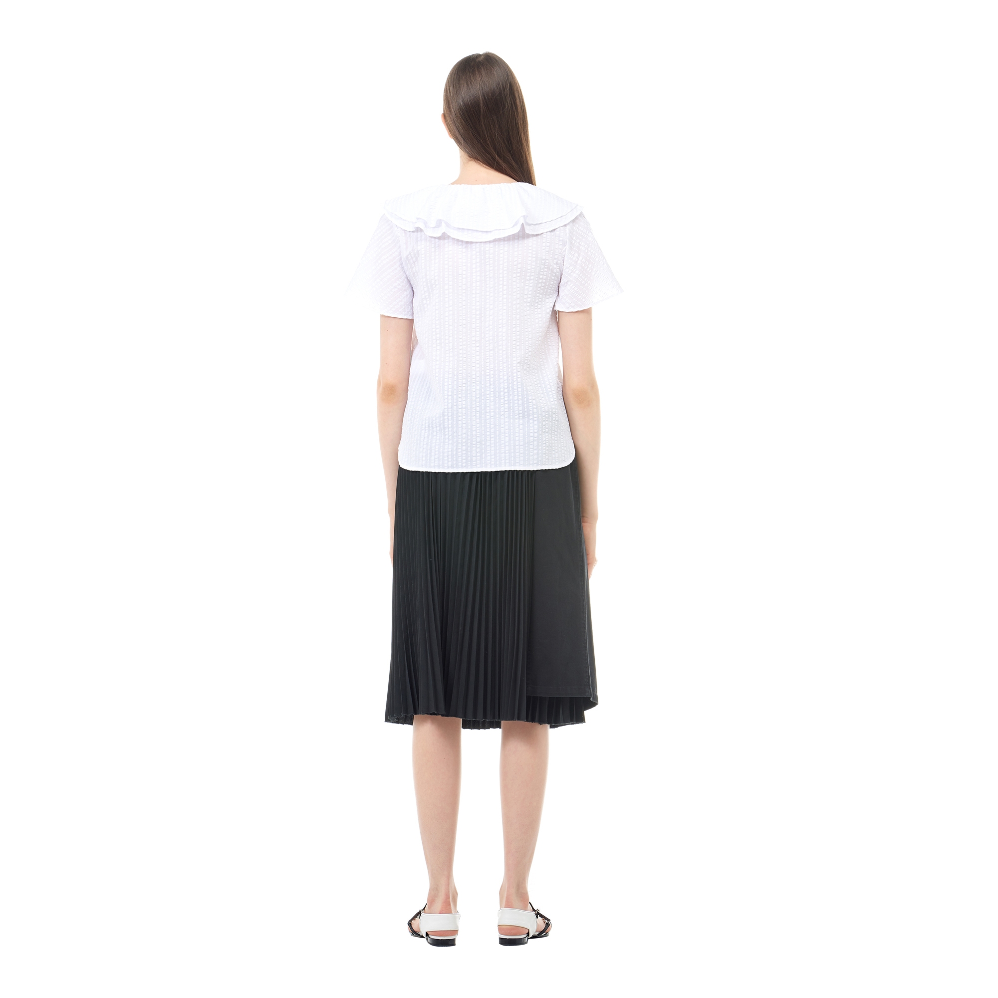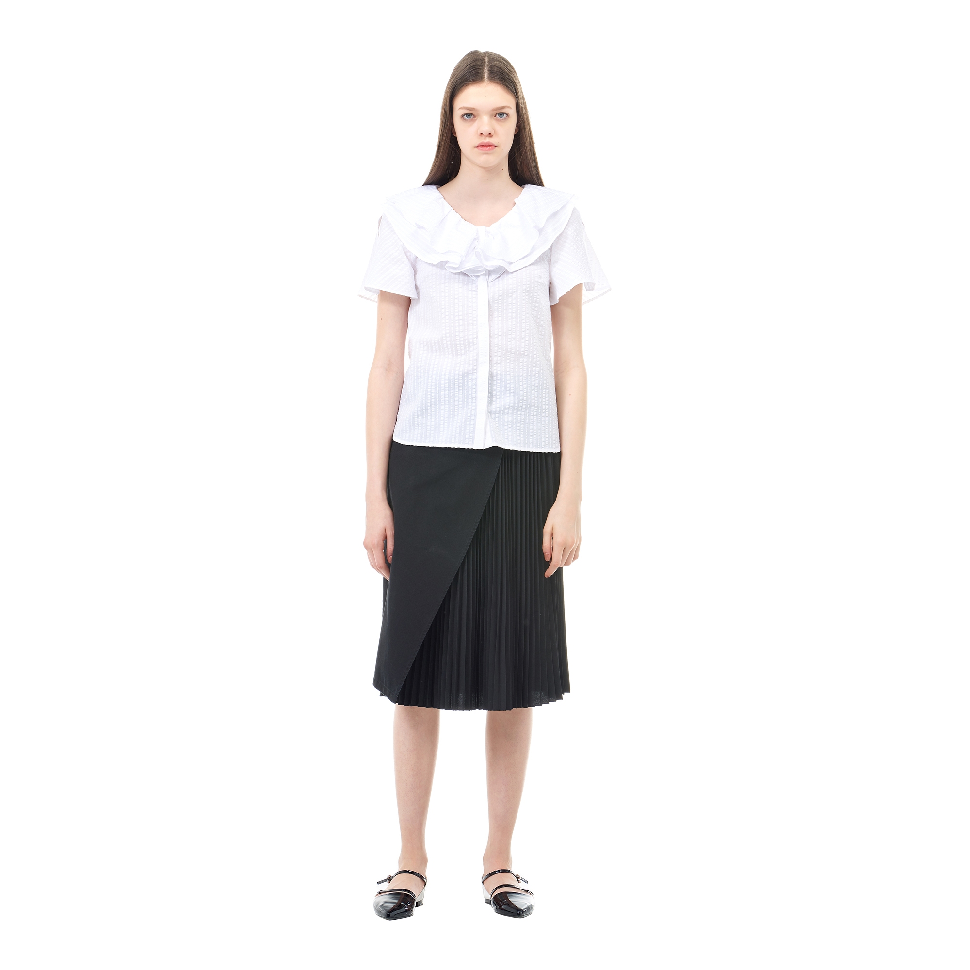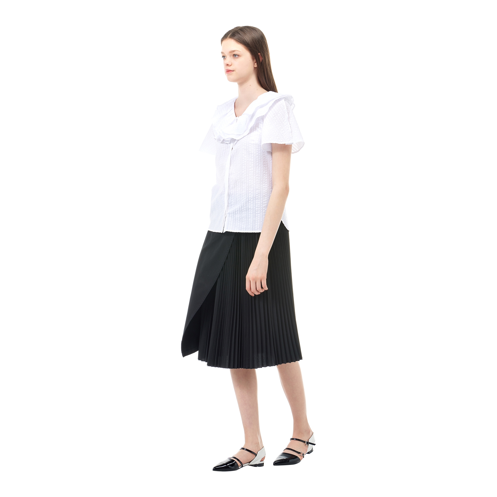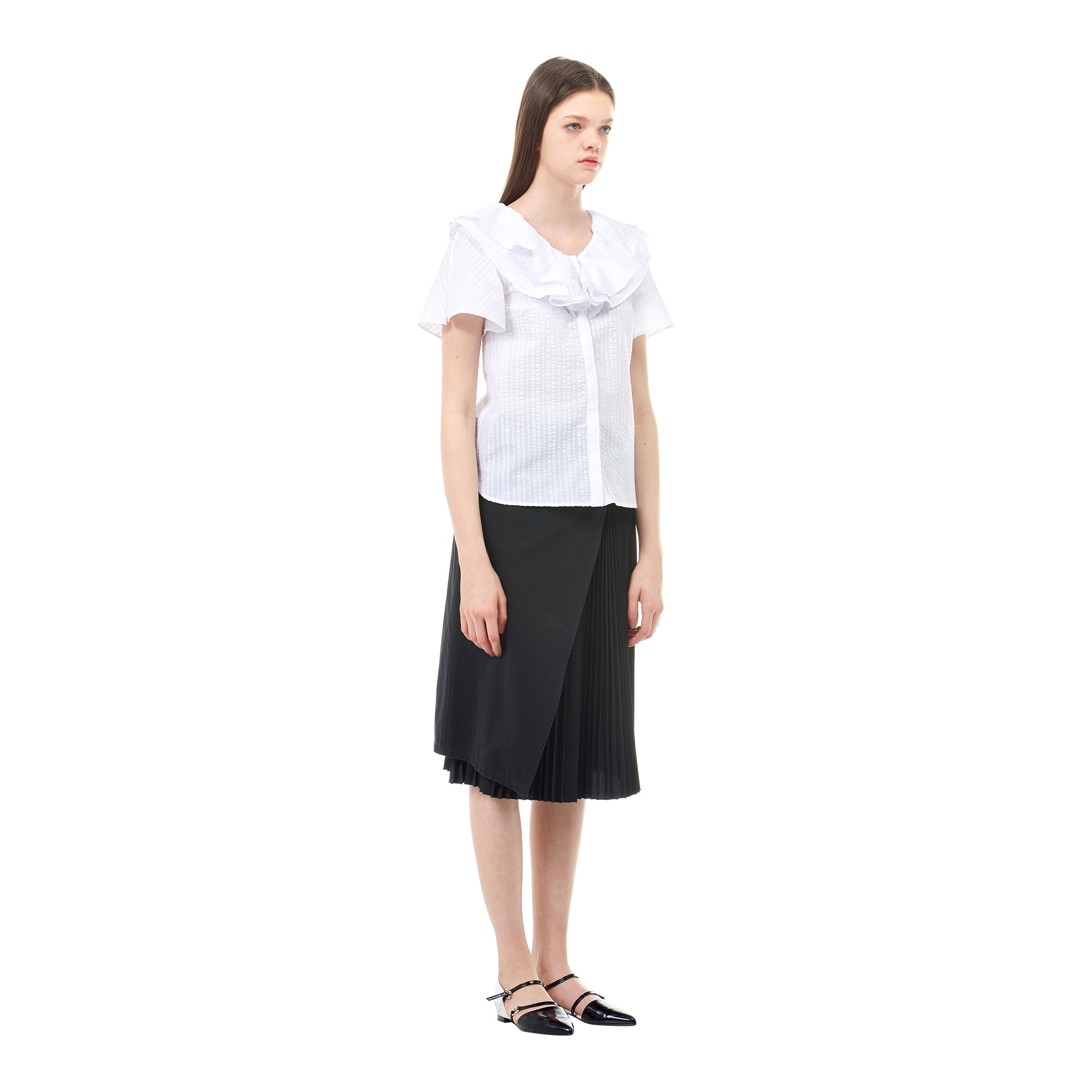 컬렉션 : 2018 Spring/Summer 디자인 포인트 : - 네크라인의 훌 디테일이 돋보이는 트렌디한 무드의 블라우스- 슬릿 슬리브 디테일과 히든 클로징 디테일로 포인트를 더한 디자인- 다양한 룩에 활용도 높은 유니크한 포인트 아이템 스타일링 추천 : 다양한 워싱의 데님팬츠 혹은 슬랙스 팬츠와 트렌디한 스타일링을 할 수 있음