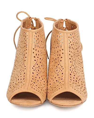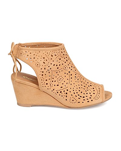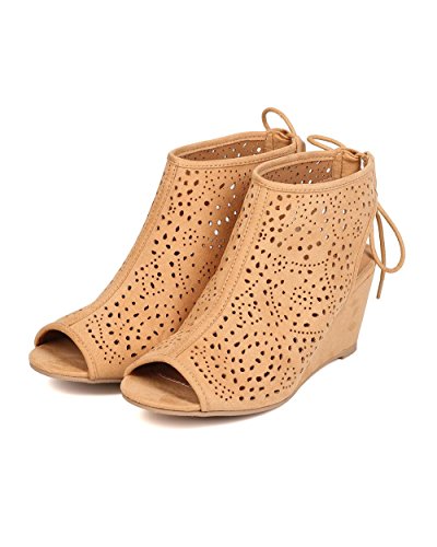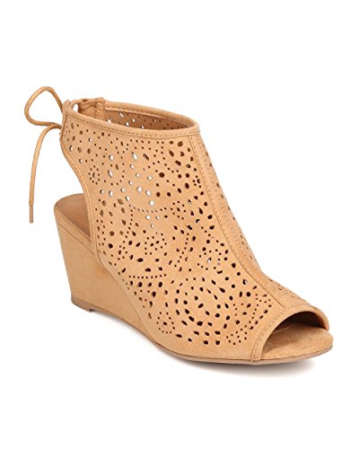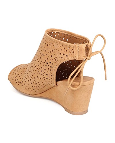 Qupid FC25 Women Faux Suede Peep Toe Perforated Single Sole Wedge Back Tie Bootie - Toffee