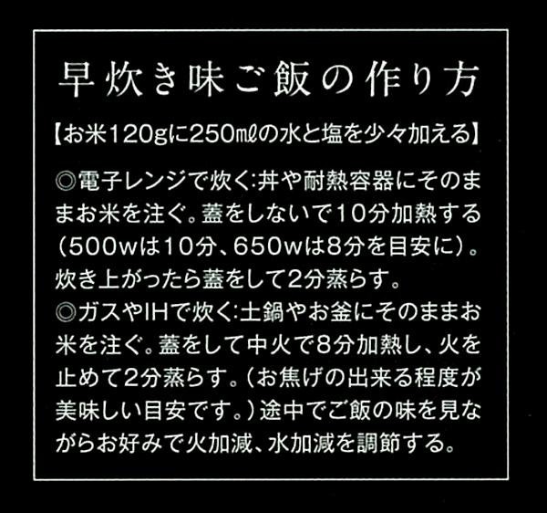 | 原材料 | 名称:味ごはんの素 米(国内産)、しいたけ、昆布、乾燥大根葉(大根葉、ブドウ糖) |