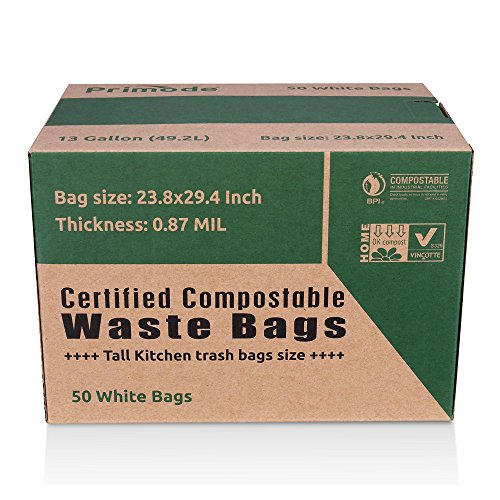 Primode 100% Compostable Bags, 13 Gallon Food Scraps Yard Waste Bags, Extra Thick 0.87 Mil. ASTMD6400 Biodegradable Compost Bags Small Kitchen Trash Bags, Certified By BPI And VINCETTE, (50)
