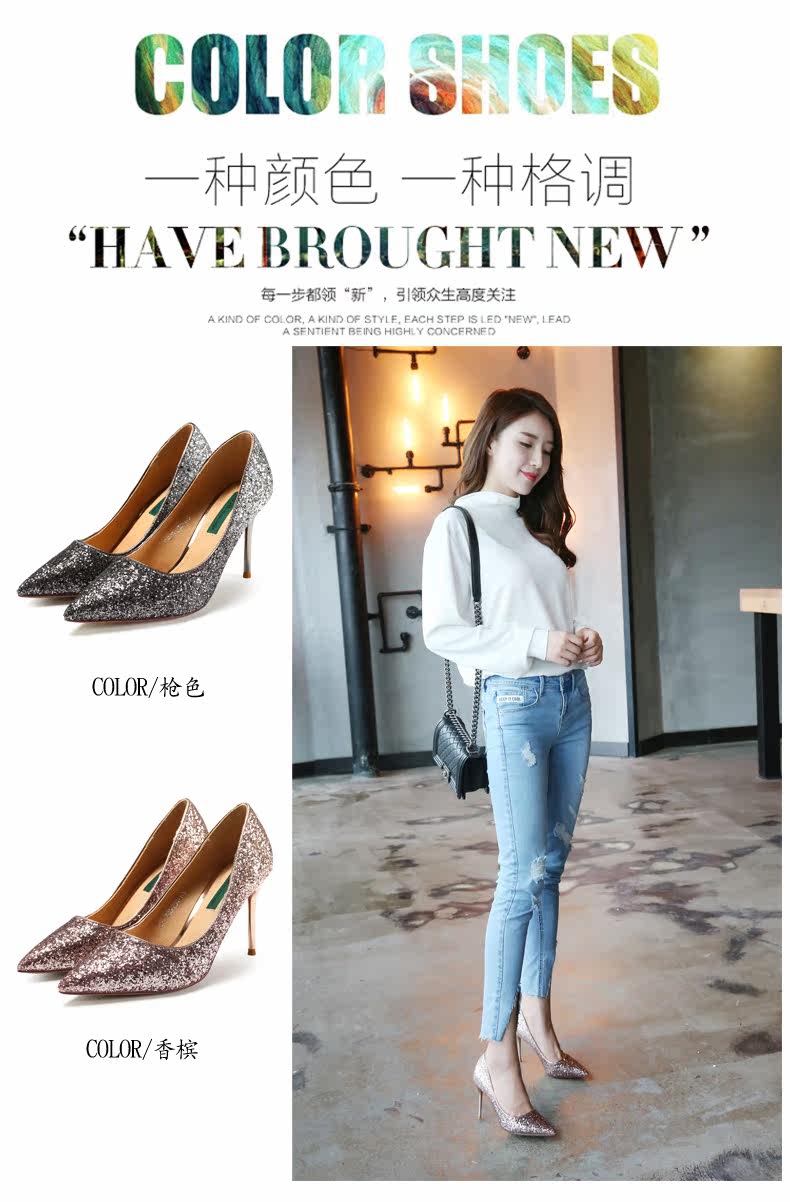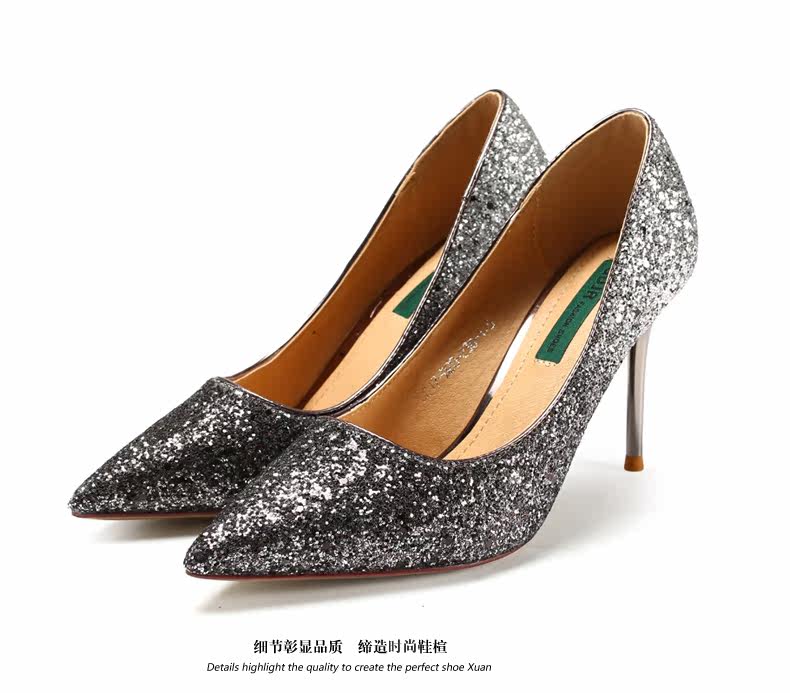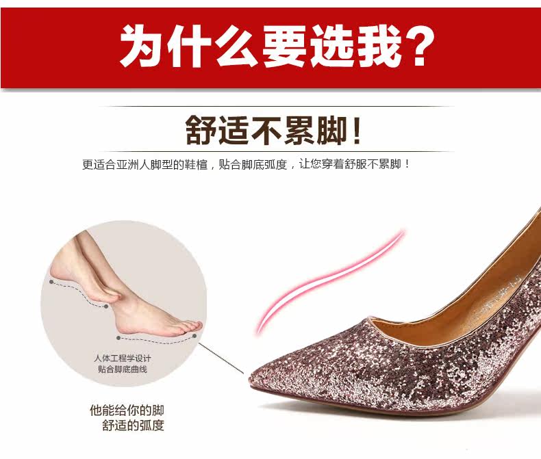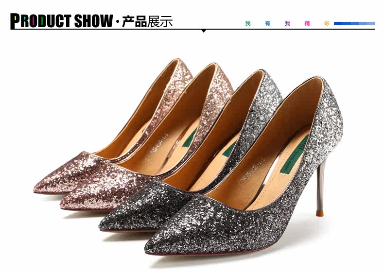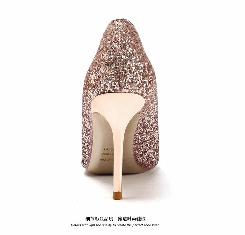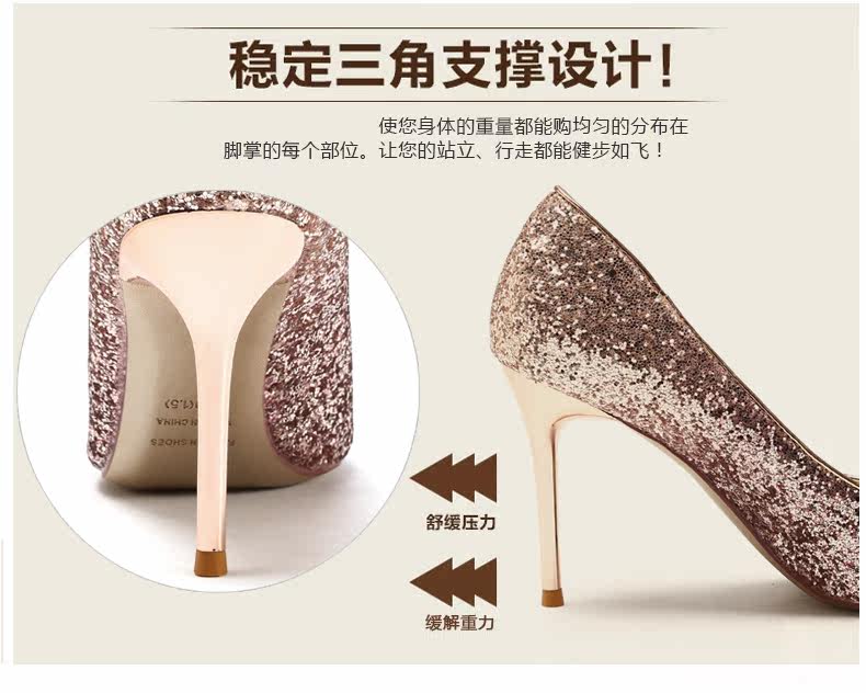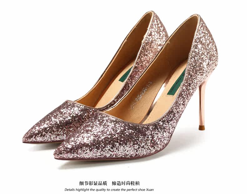 秋季浅口尖头细跟高跟鞋时尚亮皮香槟色婚鞋伴娘单鞋女