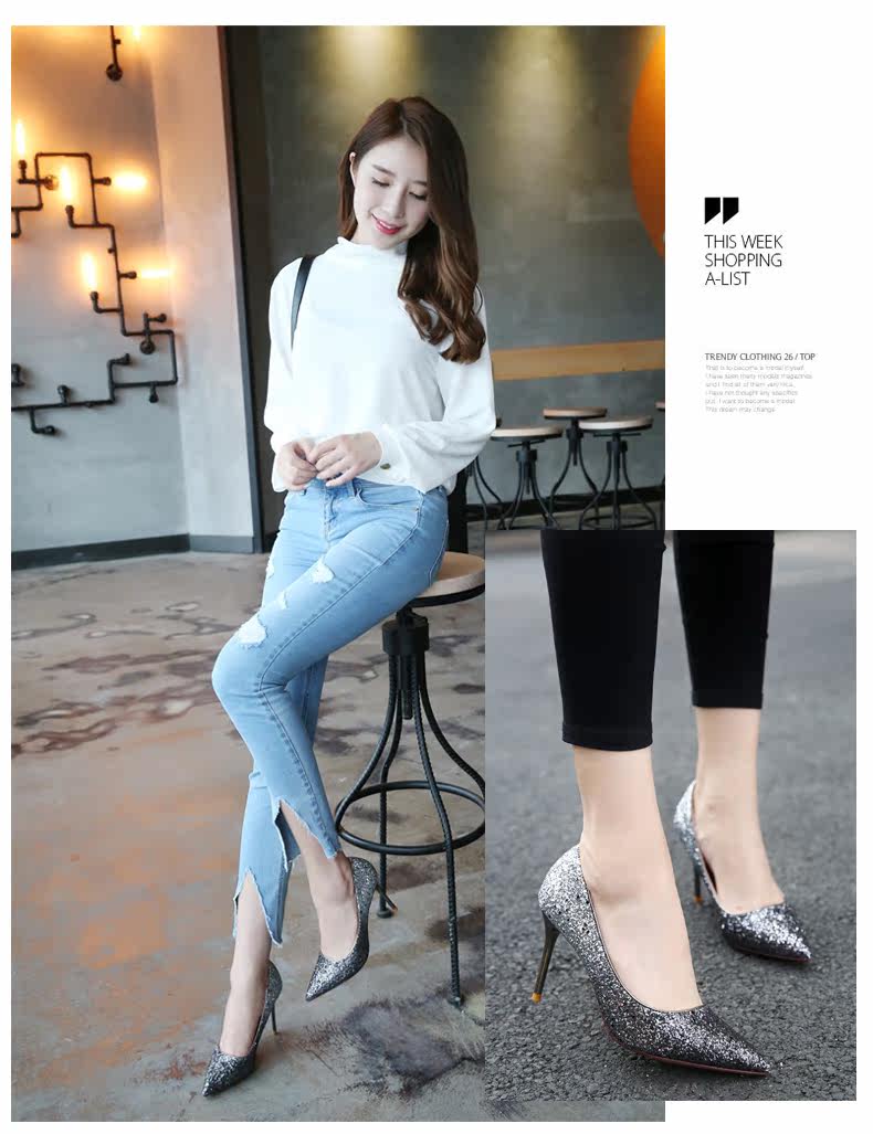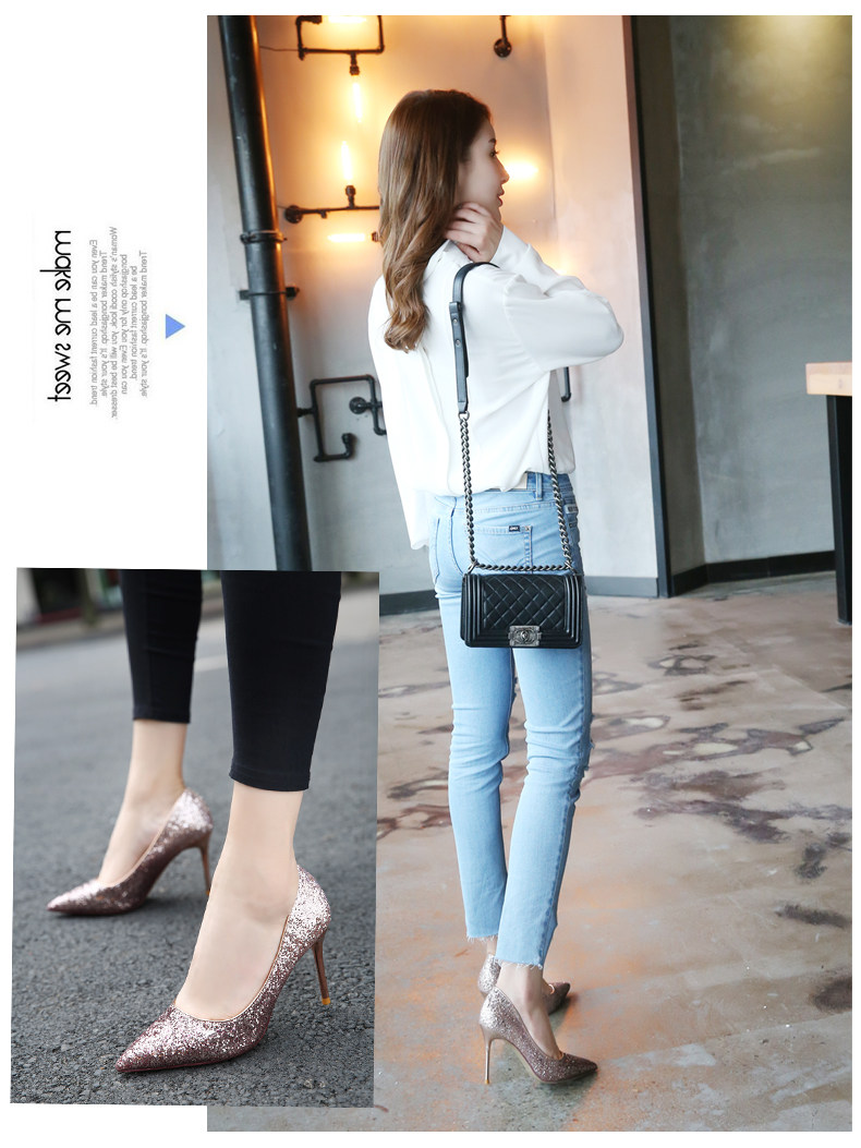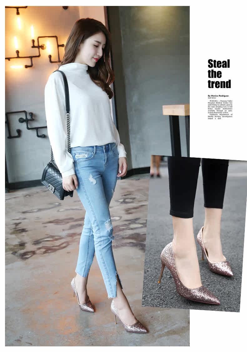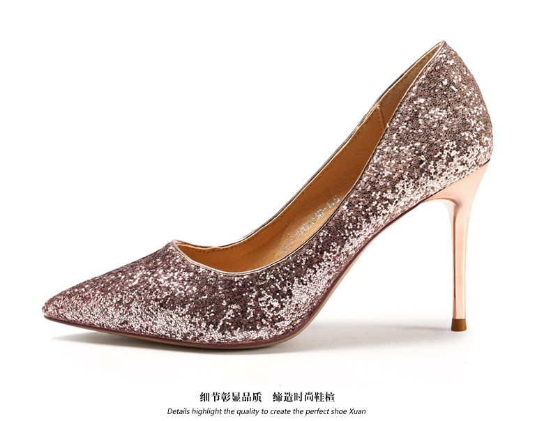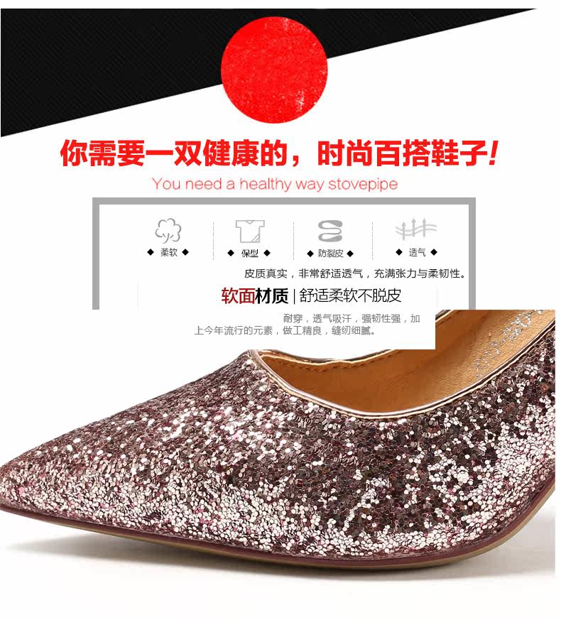 秋季浅口尖头细跟高跟鞋时尚亮皮香槟色婚鞋伴娘单鞋女