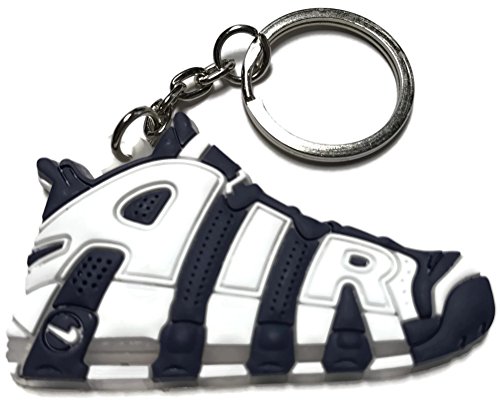 Binding : Apparel Product Description Nike air uptempo blue white shoe keychain. This is a great gift for those sneaker head friends. They are perfect to put on any car key lanyards, house keys, or a back pack. They measure 2' by 2' and are made of rubber. The keychains have a very smooth bendable property. Only single sided. 0