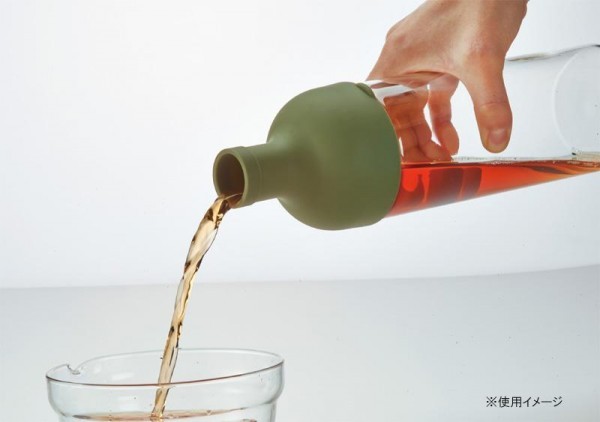 | ワインのように食事の時に水出し茶を愉しんでいただきたいという思いからできた、ワインボトル型の水出し茶ボトル。注ぎ口部分にフィルターがセットされているのでそのまま注げます。 |