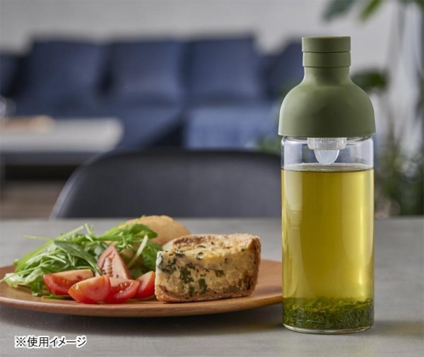 ワインのように食事の時に水出し茶を愉しんでいただきたいという思いからできた、ワインボトル型の水出し茶ボトル。注ぎ口部分にフィルターがセットされているのでそのまま注げます。 |
