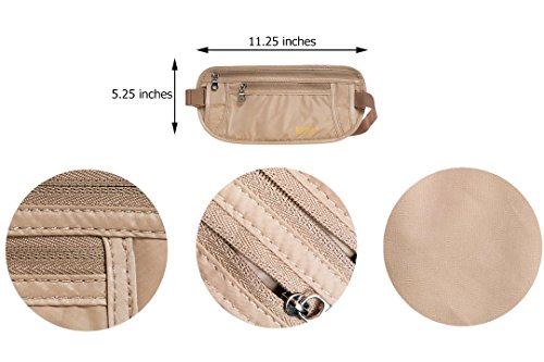-. Feature : RFID BLOCKING & SECURITY--This waist pouch with RFID blocking lining, protecting you from unwanted RFID scans of passports, ID, credit cards. Wearing it under your clothes like a hidden secure travel wallet to keep your valuables out of sight. / VERSATILE ORGANIZED DESIGN--Two main zipper pockets to fit iPhone and all smart phones. Also two mesh pockets inside the big pocket and the back panel with a concealed pocket, tons of space to store your valuables like cash, ID, credit cards, passports, documents, keys and so on. / LIGHTWEIGHT & DURABLE MATERIAL--Made of high-quality soft and smooth 70D nylon, has a breathable moisture absorbing mesh back panel, durable also lightweight to wearing. Equipped with strong zippers and buckles, reinforced double stitching to ensure a long-time use. / TRAVEL & GIFT IDEA--Don't hesitate to get this fanny pack for your outdoor activities such as travelling, hiking, running and cycling; Absolutely, It's also a stylish and practical gift to your family and friends! / SIZE & COLOUR & PACKAGE--This waist stash is W11.25 x H5.25 inches, with elasticated and adjustable waist strap to fit approx 25"- 55" waist. Also Khaki is unisex color and suitable for both men & women (Remark: Due to the light and display reason everyone see the color may vary)