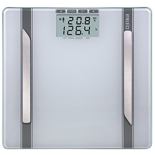 -. Feature : Read weight at a glance with 1.2-inch tall digits projected on a 3.5-inch by 1.9-inch dual-line LCD display. / With bioelectrical impedence analysis (BIA) technology, this scale estimates body water percentage, body fat, and muscle mass. / Multiple family members and housemates can save settings on the scale with memory support for up to 10 users with normal and athlete modes. / Built to accommodate up to approximately 400 pounds (180 kilograms), this 12.4-inch square white platform is accented with the stainless steel electrode contacts. / Powered by a CR2032 lithium battery, the scale automatically turns on as soon as the scale is in use with the auto on feature.