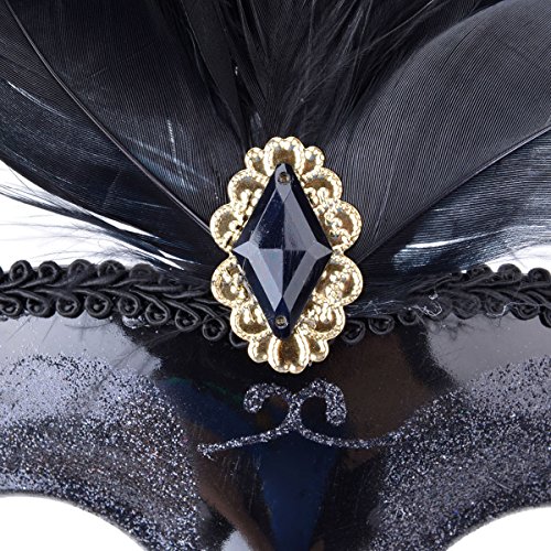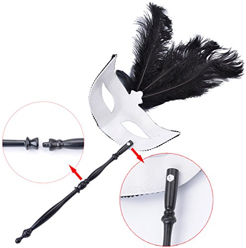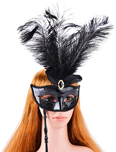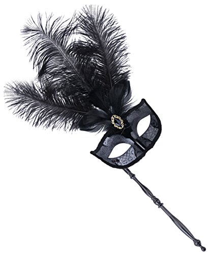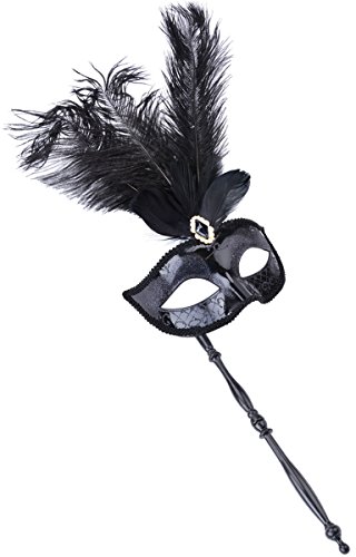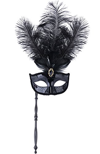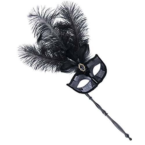 -. Title : Coxeer Masquerade Mask Half Face Feather Mask on a Stick Black Mardi Gras Mask