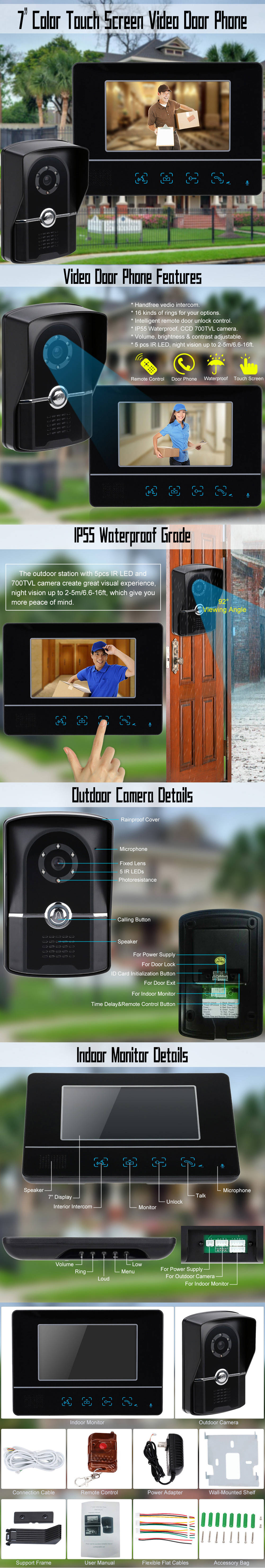 ?This amazing doorphone intercom system could be actually effective solution for improving security of your property. Advanced technology and the latest computer chips are adopted in this inter system for high stability and durability. Its 7" TFT screen with 700TVL infrared camera sensor provide you with high quality images for monitoring use even at night£¬ night vision up to 2-5m/6.6-16ft. Hands-free design with sensitive touch panel brings you further convenience£¬ you can open the door by the remote controller. Ultra-thin wall mounting and glossy design applied make the unit look more elegant and graceful. As to applications£¬ it can be widely used in apartments£¬ villas£¬ hotel and offices.