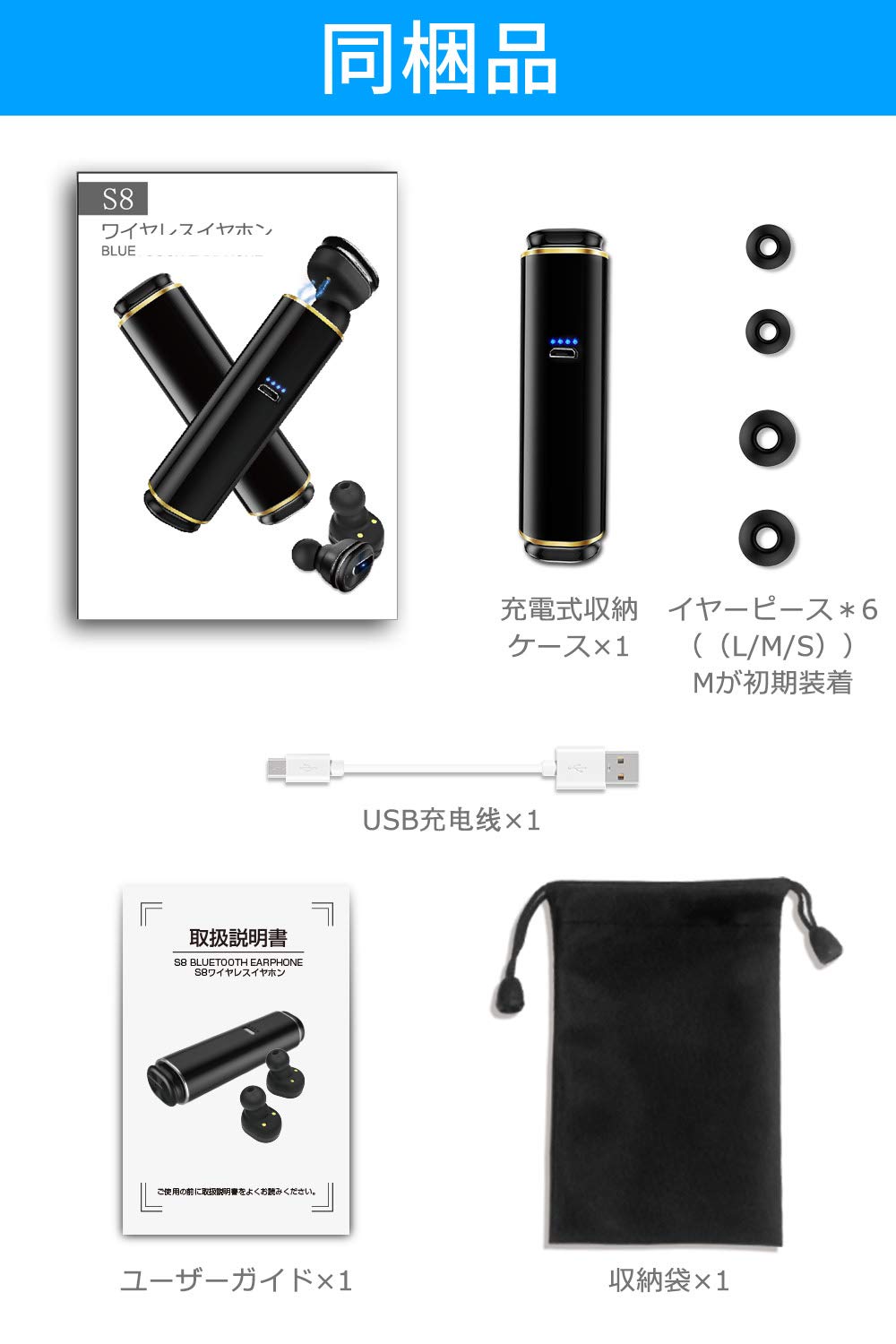 ♬【パッケージ内容】イヤホン×2、携帯式充電ボックス×1、マイクロUSBケーブル×1、イヤーピース*6(S/M/L)、日本語取扱説明書(日本語取扱説明書または付属品が不足になった場合、販売店にメールを送信していただければ、再発行する対応ができます)。