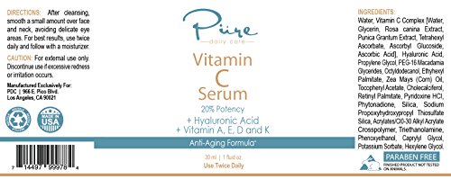 - Feature : VITAMIN C ESTER - Our serum is formulated with 20% concentration of Vitamin C Ester. Vitamin Ester is the most bio-available form of vitamin c. It has superior absorption and is more molecularly stable than conventional Vitamin C making it the best choice for your delicate facial skin / HYALURONIC ACID - Pharmaceutical grade Hyaluronic acid compliments Vitamin C Ester boosting your skins ability to retain moisture resulting in younger, firmer and healthier looking skin; guaranteed. Our Hyaluronic Acid is 100% pure and you will instantly see results as it plumps skin to remove fine lines and wrinkles / FULL SPECTRUM VITAMINS - We include a full spectrum of vitamin support including Vitamins A, E, D and K to instantly absorb and help fight free radical damage while boosting the skins natural repair rate / WILD DOG ROSE AND POMOGRANATE EXTRACTS - We use 100% real wild rose and pomogranate extract as extremely potent nourishers. These two extracts are particularly effective in fighting inflamation and surface damage to skin while also acting as natural UV protection / GUARANTEED RESULTS - We stand by our serum and know you'll love it. Use our serum for 14 days alone or compliment your existing skin care regimen for amazing results or your money back.