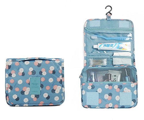 Product Description Hanging Travel Kit. This kit is essential for staying organized on vacation or a trip to the gym. Constructed of durable 70 Denier Nylon, it has two main compartments: one that unfolds to a large open hanging compartment with three clear, roomy zippered pockets and another large zippered compartment that can hold additional items. Also features a convenient carrying handle and D-ring that double as a hook for hanging. You can hang the toiletries pouch on the wall and use it comfortably in the toilet and contain or bring your belongings in the separated sections. Reinforced hanging hook makes it easy to store on towel racks, shower rod or on door knobs. This hanging organizer folds up into a compact. 0