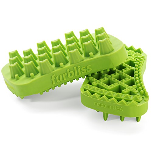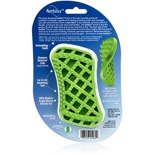 Furbliss is the most revolutionary pet brush on the market and is the "No Fuss Brush!" Traditional pet brushes are made out of metal, steel, or wire that cause discomfort and may harm your pet. Furbliss is made from 100% soft medical grade silicone that provides comfortable and safe brushing. This patented two-sided design provides brushing, deshedding, massaging, relaxing, and exfoliation ALL-IN-ONE! The multi-functional design can be used wet or dry and is perfect for baths! The silicone material attracts fur like a magnet and the backside of the Furbliss brush can remove fur and lint from clothing, furniture, and auto interiors. Cleaning the Furbliss brush is a breeze... simply rinse under water or throw into the dish washer or washing machine! Veterinarian and groomer recommended for all pets and coat types. Your pet will feel pure bliss with Furbliss!Feature