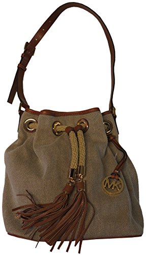 -. Brand : Michael Kors -. Color : beige -. Department : womens -. EAN : 0190049113387 -. Feature : 10"L double handles / Drawstring and magnetic snap closures / Exterior features gold-tone hardware and hanging logo medallion / Interior features 1 zip pocket, 1 cellphone pocket, 3 open pockets and key chain / 10" W x 10-1/2" H x 5-1/2" D -. ProductGroup : Shoes -. ProductTypeName : HANDBAG -. Size : Large -. Title : Michael Kors Marina Canvas Large Drawstring Shoulder Bag -. UPC : 190049113387