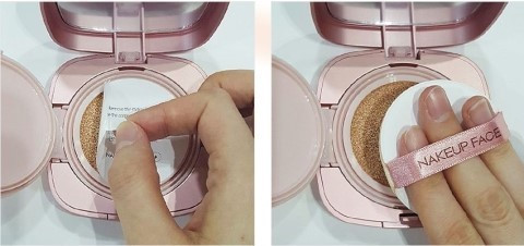 1. Detach the sticker of the covering powder cushion.2. Get appropriate amount on puff and gently pat on your face.