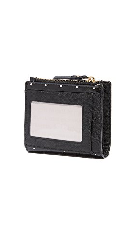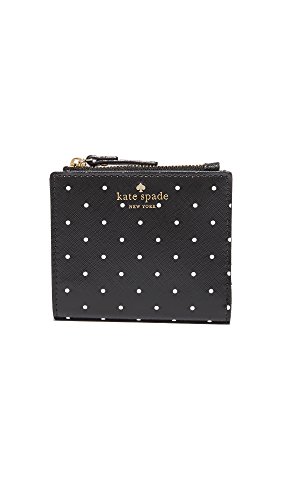 A bifold Kate Spade New York wallet in polka-dot, saffiano leather. Snap closure. 1 cash pocket, 6 card slots, and a zip pocket. ID window at the back.