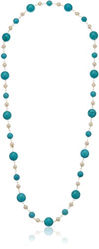 28-inches "opera" length necklace crafted from combination of white freshwater cultured pearls and simulated turquoise howlite, link with with 18k yellow gold plated sterling silver.