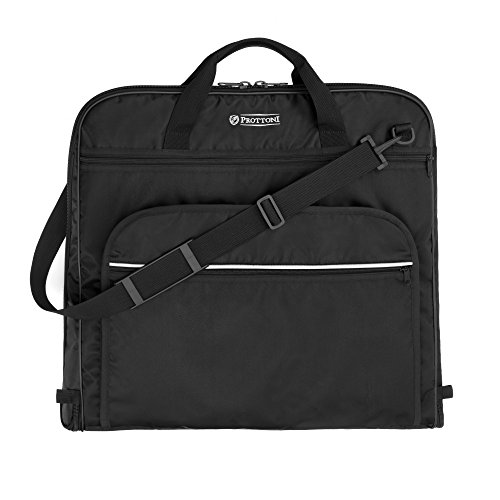 -. Brand : Prottoni -. Color : Black -. Department : unisex-adult -. EAN : 0683203897228 -. Feature : FOUR OUTSIDE POCKETS FOR EASY ORGANIZATION that let you travel with not only suits, but also spare clothing, shoes and accessories. This garment bag is designed to fit everything you need for your next trip. / HIGH QUALITY, WATER RESISTANT POLYESTER WITH WATERPROOF LINING used in our carry on suit bag keeps your clothes dry even in a heavy downpour. / ADJUSTABLE HEAVY DUTY SHOULDER STRAP allows you to easily carry our garment bag even when fully loaded. You can always detach it from the garment bag if you prefer to carry it by the handles. / TWO SECURE INTERIOR D-RINGS fit up to 6 hangers depending on their size. If needed, you can always pull out hangers through specially designed space to hang the whole garment bag. / SPECIALLY DESIGNED CURVED BOTTOM to minimize amount of wrinkles on your garments. ABOVE ALL, WE ENSURE THE HIGHEST QUALITY due to our control of the whole production process from fabric sourcing to manufacturing in Europe. -. ProductGroup : Apparel -. ProductTypeName : LAGE -. Size : One Size -. Title : Prottoni 44" Garment Bag with Shoulder Strap - 4 Zippered Pockets - Carry On Suit Bag - Water Resistant Travel Bag -. UPC : 683203897228