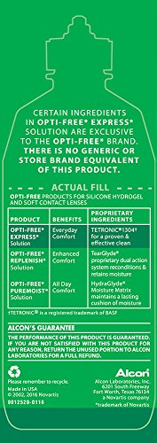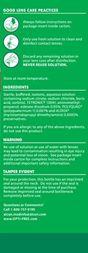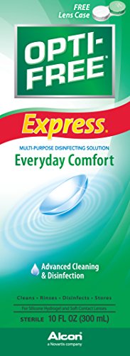 Opti-Free Express Multi-Purpose Disinfecting Solution uses an exclusive formula for cleaning, disinfecting, and removing protein deposits from contact lenses. Opti-Free Express solution cleans by loosening and removing any buildups of protein or other debris that attaches to the lenses. The solution will also eliminate dangerous microorganisms on the surface of the lenses to ensure that infections do not occur. The exclusive 2D formula, which contains Polyquad and Aldox to help get rid of microorganisms that can cause eye infections. For the best results, thoroughly wet and rub each side of the lens for 20 seconds. Afterwards, rinse each side of the lens for 10 seconds with a steady stream of the solution. Let the contact lenses soak inside the lens case for a minimum of 6 hours or overnight. It is safe to leave contact lenses soaking in the solution inside of a closed case for up to 30 days before being cleaned and disinfected again. Opti-Free strives to continue providing patients with the newest and most effective contact lens products on the market for dry and irritated eyes.Feature