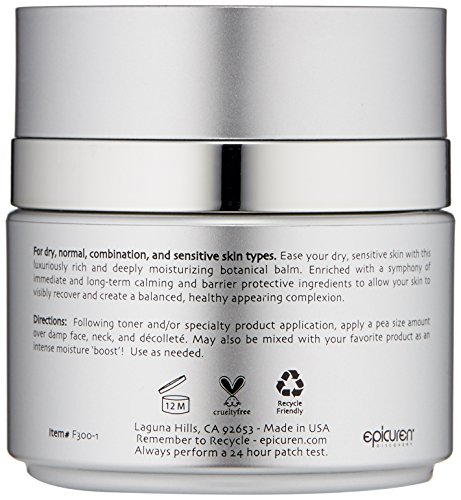 -. Binding : Health and Beauty -. Brand : Epicuren -. EAN : 0842370035462 -. Feature : Made with long-term calming and protective ingredients to allow your skin to recover and become nourished / This product is ideal for those with dry skin types / This soothing balm is gentle enough for even the most sensitive skin types. -. Label : Epicuren -. Manufacturer : Epicuren -. MPN : EPI-F300-1 -. PackageQuantity : 1 -. PartNumber : EPI-F300-1 -. ProductGroup : Health and Beauty -. ProductTypeName : HEALTH_PERSONAL_CARE -. Publisher : Epicuren -. Size : 1oz -. Studio : Epicuren -. Title : Epicuren Soothe Dermal Repair Balm (1 oz) -. UPC : 842370035462