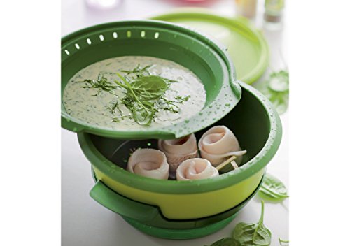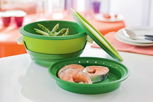 Steaming is one of the healthiest ways to prepare food because it retains nutrients, fatty acidss and vitamins while preserving color, texture and flavor. The Smart Steamer blocks microwaves from cooking foods. Instead, microwaves are directed to the Water Tray, causing the water to boil and the steam to rise for perfectly steamed foods. Two-tiered system lets you steam one or two foods are once. Includes 1 3/4-qt./400mL Water Tray, Steamer Base, Colander Tray and Cover. Recipes included. Color: Moss/GuacamoleFeature