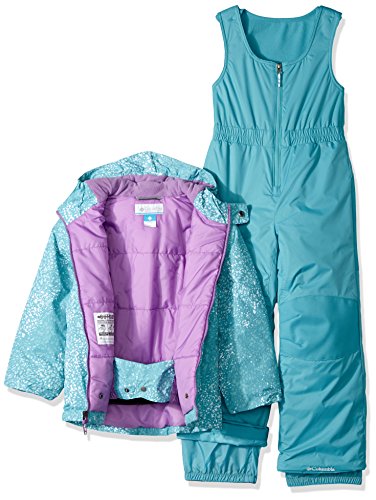Columbia Infant and Toddler Size Chart Columbia Little Kids and Big Kids Size Chart Chilly temps can't keep your kid off the powder, so make sure they're ready for ski and snowboard adventures with the Frosty Slope™ Set. Regular Fit is an easy, lightly relaxed fit for comfortable range of motion. Omni-Shield™ Hydra Cloth shell:• Waterproof exterior adds extra protection against the elements and helps prevent staining• Dries faster than traditional fabric.• Retains less moisture than conventional material. Microtemp XF II insulation:• Polyfill insulation offers warmth without excessive bulk.• Crimped design increases surface area for improved warmth retention.• 100 g/m² fabric weight. OUTGROWN™ grow system allows for multi-season wear.Jacket: Attached, adjustable storm hood with microfleece lining. Full zip closure. Snap-button hand pockets. Snap-back powder skirt with silicone gripping.Snow bib: Microfleece lining. Adjustable suspenders. Full zip closure. Cinched waist. Gusset detail. Articulated knees. Hammerhead reinforcement at seat, knees and cuff guard. Internal leg gaiter. Silicone gripping at leg opening. Shell & Lining: 100% nylon.Insulation: 100% polyester. Machine wash cold, tumble dry low. Imported. Measurements: Length: 15 1⁄2 in Chest Measurement: 14 in Sleeve Length: 11 1⁄2 in Waist Measurement: 22 in Outseam: 18 in Inseam: 11 1⁄2 in Front Rise: 8 in Back Rise: 8 in Leg Opening: 14 1⁄2 in Product measurements were taken using size 2T Toddler. Please note that measurements may vary by size.Feature
