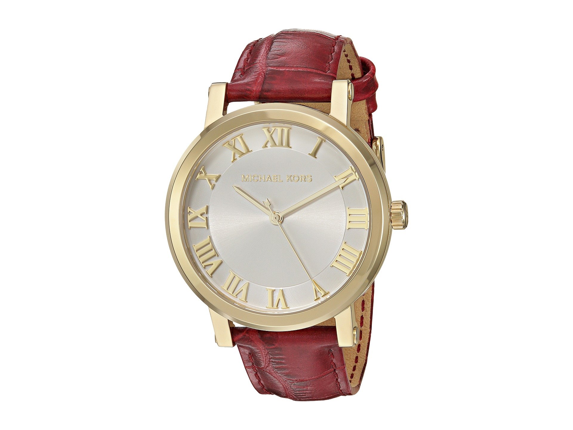 | Product Information SKU: #8854556Embrace the luxurious and classic style of the Michael Kors? Norie watch to accentuate any look! Stainless steel case.Croco-embossed leather strap with adjustable buckle closure.Round face.Three-hand analog display with quartz movement.Brushed dial features gold-tone hands, Roman numeral hour markers, and Michael Kors detailing.Water resistant 10 ATM.Display case included.Imported.This product may have a manufacturer's warranty. Please visit the manufacturer's website or contact us at warranty@support.zappos.com for full manufacturer warranty details.Measurements: Case Height: 37 3?10 mm Case Width: 37 3?10 mm Case Depth: 9 1?10 mm Band Width: 16 0?1 mm Band Circumference/Length: 8 in Weight: 1.8 oz |