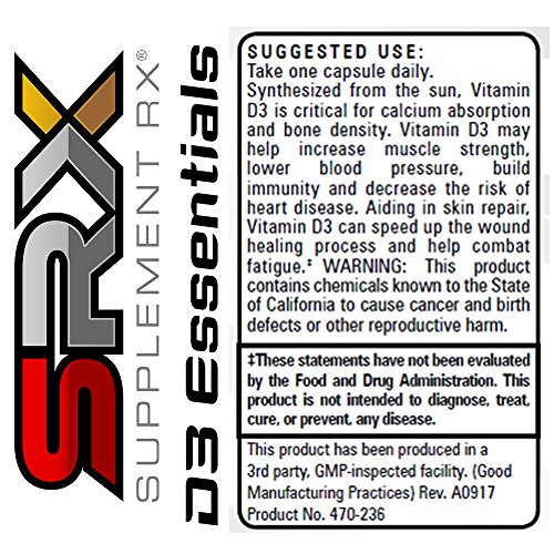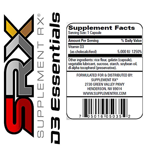 Synthesized from the sun, Vitamin D3 is a critical aid in calcium absorption which may build bone density. D3 Essentials contains 5,000 IUs per serving of Vitamin D3 which may help increase muscle strength, may lower blood pressure, may build immunity and may decrease the risk of heart disease. All Supplement Rx Products are Guaranteed to be Formulated with research-proven, science-based, patented ingredients; Certified Pure, pharmaceutical-grade supplements manufactured in FDA-registered labs under the GMP and NSF certifications; Label-tested for Potency, what's on the label is what's in the container...no more, no less; Time-released, so that the nutrient delivery systems are maximized for absorption; Safe & Effective because they have been market-tested in top health clubs throughout the country; Synergistically designed to be used with other Supplement Rx products to ensure no nutrient overages or adverse events when used as recommended; Assembled with therapeutic dosages that go above and beyond the FDA suggested daily values; Made without synthetic vitamins; Prepared with organic and natural ingredients whenever possible; Competitively priced and exclusive to the gym industry; Created, Developed, Formulated, and Manufactured in the U.S.A.Feature