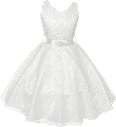 Very elegant dress with beautiful white lace overlayed bodice and double layered tulle skirt. Lovely charmeuse bow sash (attached) over the waistline adds finishing touch.
