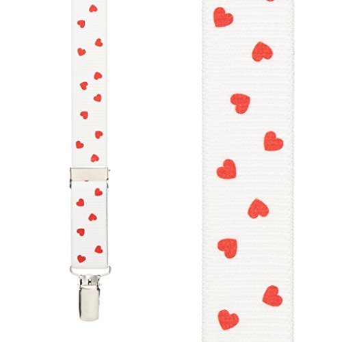 Binding : Apparel Product Description Kids LOVE these festive hearts suspenders! Featuring a sprinkling of small red hearts on a while background, these 1-inch wide elastic suspenders have a sewn X-back construction and high quality nickel clips and adjusters. Available in 3 sizes to ensure a perfect fit. The 25" length fits kids up to 2 years old; the 30" length fits kids 2 - 5 years old; and the 36-inch length fits kids 5 years old to 5' tall of average build. If in doubt order the larger size as suspenders can be shortened but not lengthened. 0