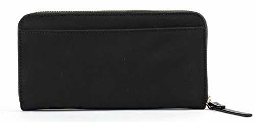 -. Feature : Nylon exterior with saffiano leather interior; 14-karat light gold plated hardware / 3.9"h x 7.6"w x .8"d / Zip around closure / 12 credit card slots, 2 billfolds, zipper change pocket and exterior slide pocket