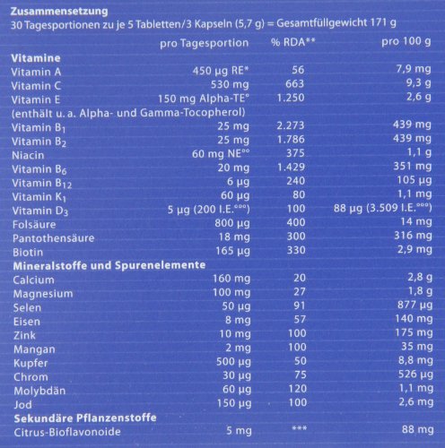 Nettofüllmenge:Tagesportionen zu je 5 Tabletten plus 3 Kapseln (5,6 g)