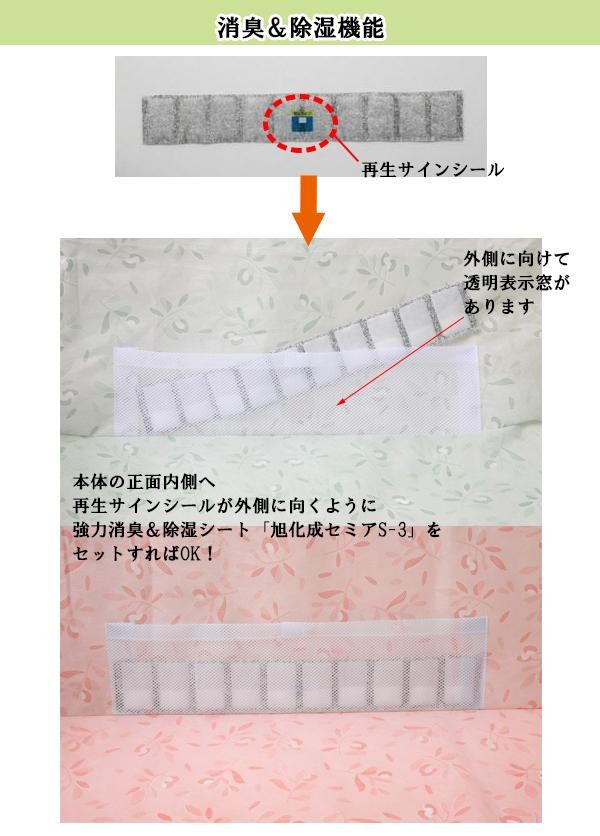 | 素材・材質 | 本体:ポリエステル不織布 窓:ポリエチレン 消臭&除湿シート:旭化成セミアS-3、B型シリカゲル ファスナー:ポリエステル |