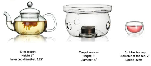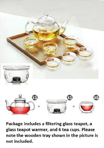 - Feature : This beautiful tea set comes with a 27 oz teapot with a removable filter cup, a teapot warmer, and 6 units of 1.7 oz tea cups. / All pieces are made entirely of heat resistant borosilicate glass. Good for hot, iced tea, coffee (bag cofee) brew; Elegant and modern design. / The roomy removable filter allows tealeaves to expand and provide full infusion of the leaves. / It is easy to brew loose tea. Just put the tea into the inner cup and add some water, then the inner cup releases infused tea directly into the outside teapot. / The tea warmer cozy can fit most teapots. 6 beautiful cups have double layers having good thermal insulation. PLEASE NOTE the wooden tray shown in the pictures is not included in the package.